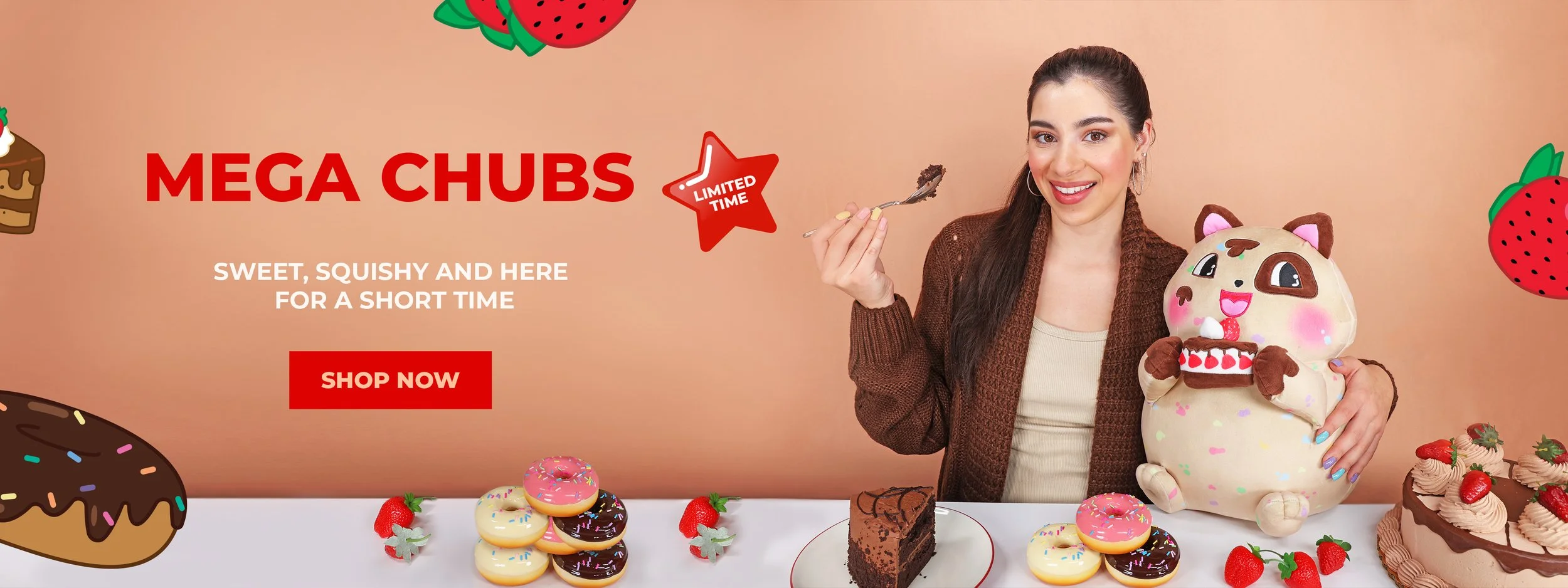 Mega Chubs is here in all his mega-ness! Cake always at the ready, he is here as a BIG plush with an even bigger appetite. He has a sweet tooth and personality to match— he may even be nice enough to share!